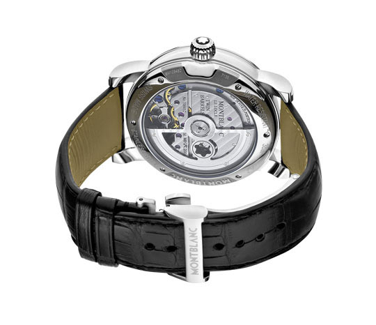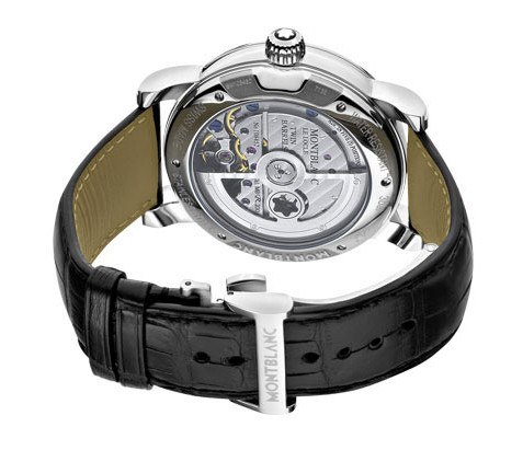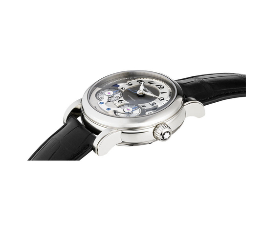 43 mm watch with stainless steel case, Montblanc Calibre MB R200, monopusher chronograph with automatic winding, anthracite-coloured dial with applique hour circle, date display, second time zone with day/night display, chronograph counters with rotating discs.